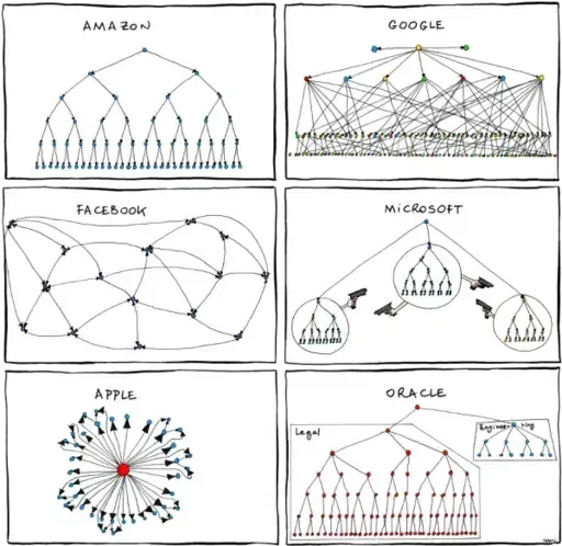 Org charts are images of structure; it's common to hear that each one reflects a company's values (also true of code structure).